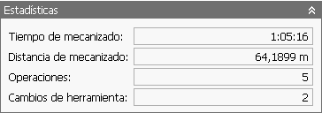 El grupo Estadísticas contiene información acerca de la ruta de herramienta completa que se está simulando. La información actual es el tiempo de mecanizado total, la distancia de mecanizado total, el número de operaciones realizadas, y el número de cambios de herramienta. Tenga en cuenta que el tiempo de mecanizado es un cálculo aproximado que puede diferir mucho del tiempo de mecanizado real después del procesamiento posterior.