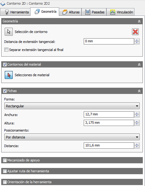 Puede añadir fichas a la ruta de herramienta Contorno 2D para sostener con firmeza la pieza de trabajo mientras se mecaniza todo el material restante. Las fichas son muy útiles al cortar material de madera o de plástico fino con enrutadores 2D.