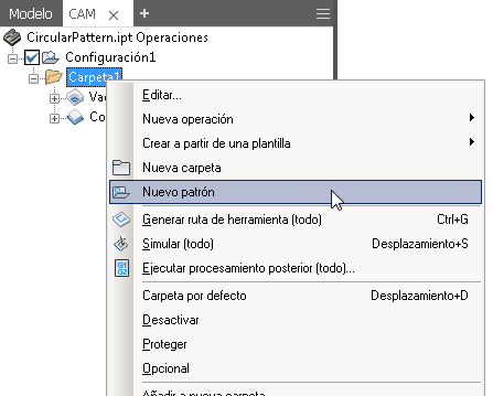 Para crear un nuevo patrón de ruta de herramienta, primero debe seleccionar las operaciones que duplicar o de las cuales crear el patrón desde el Navegador de CAM y, a continuación, hacer clic con el botón derecho y seleccionar Añadir a nuevo patrón en el menú contextual emergente.