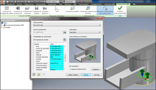 En un archivo de pieza o ensamblaje, seleccione el formato de archivo IFC en el comando "Exportar componentes de construcción" en el entorno de intercambio de BIM. El modelo se escribe en formato *.ifc y contiene la geometría 3D y la información de propiedades de material para utilizarla posteriormente.