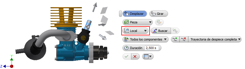 Ahora puede especificar la dirección de movimiento utilizando el sistema de coordenadas local (componente) o el sistema de coordenadas universal (presentación) en la barra de herramientas pequeña. Para la selección múltiple define las alineaciones del sistema de coordenadas local con el primer objeto seleccionado.