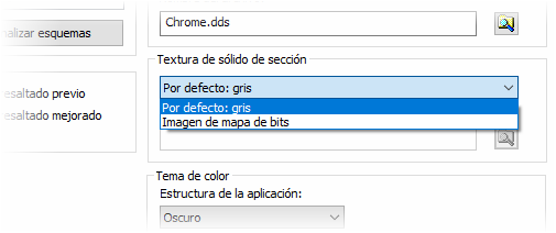 Textura de sólido de sección, puede especificar un mapa de texturas para utilizarlo con las caras de recubrimiento utilizadas en las vistas seccionadas del modelo. El valor por defecto es el color gris. Si desea utilizar otro color, cree una imagen y selecciónela para utilizarla como textura de sólido de sección.