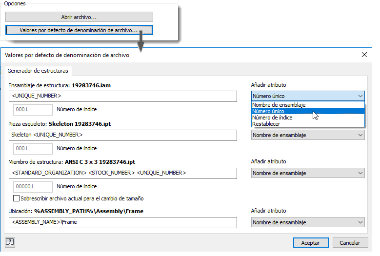 En el cuadro de diálogo Valores por defecto de denominación de archivos, haga clic en las listas desplegables Añadir atributo para configurar el plan de denominación.