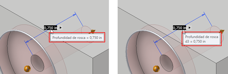 Cuando un valor del comando Agujero no es válido (por ejemplo, cuando la longitud de rosca especificada es superior a la profundidad del agujero), el color del valor se vuelve rojo y, al introducir el valor, este se indica como no válido en la información de herramientas. Esto le permite corregir el valor de inmediato o buscar otro valor que deba editarse para que este sea válido. Cuando el valor es válido, el color del valor es negro.