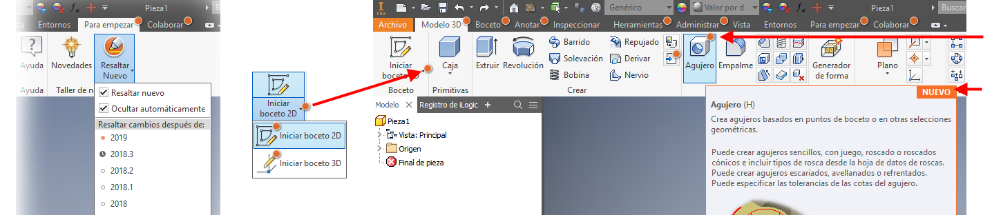 A continuación, se indican algunos ejemplos de las diferencias entre las versiones anteriores (imagen de la izquierda) y la versión 2019.1 (imagen de la derecha):