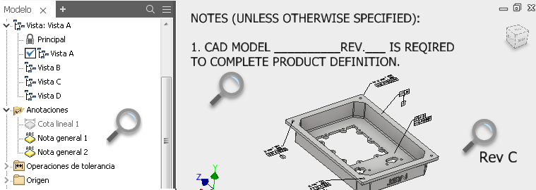 - Active las vistas B, C y D, y desactive la visibilidad de Nota general 1 y 2.