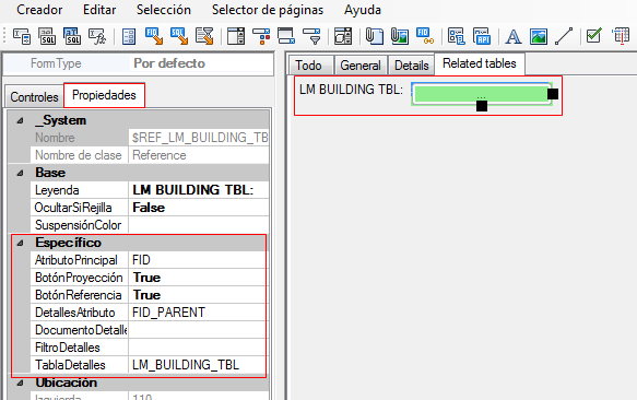 Creador de formularios: los controles de tipo Referencia se parecen a un botón y permiten acceder a datos relacionados. Pulse el control del panel de la derecha y defina sus propiedades.