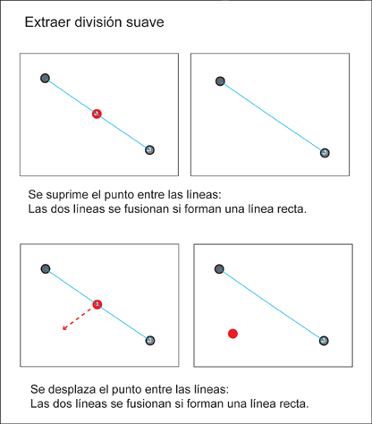 Caso 1: fusiona líneas cuando se suprime el punto que existe entre ellas. En el caso siguiente: comparten el mismo atributo. Las geometrías son tales, que las dos líneas podrían ser el resultado de una división suave.