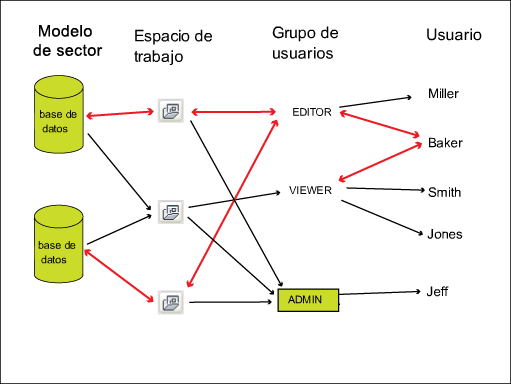 Tras la instalación, hay un usuario por defecto, el administrador, que es miembro del grupo de usuarios ADMIN. Solo para los modelos de sector empresarial, es posible crear más grupos de usuarios con diferentes derechos de acceso, como VIEWER y EDITOR. Cree un usuario para cada persona que trabaje con el modelo de sector empresarial, como el Sr. Smith o la Sra. Miller.