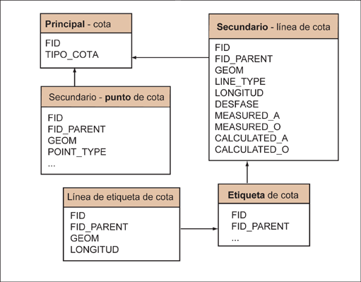 Existen clases de elemento especiales para almacenar acotaciones en la base de datos. Una acotación consta de varias clases de elemento relacionadas. Una clase de elemento de acotación (clase de elemento de atributo principal) tiene relación con varias clases de elemento secundarias que almacenan los componentes geométricos, como los puntos (símbolos) y las líneas, y las etiquetas.