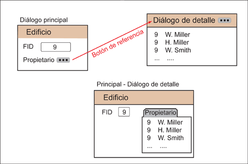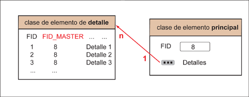 En una relación de principal-detalle, la clase de elemento puede tener varias relaciones con otra clase de elemento. Por ejemplo, un elemento principal, como un edificio, puede tener varios elementos de detalles. De igual forma, cada elemento puede tener varias etiquetas.