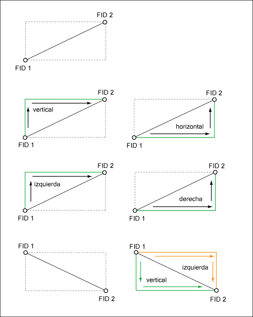 La dirección de las líneas que unen dos puntos se deriva del FID. Por ejemplo, se creará una línea de FID de 1 a FID 2, que comenzará en dirección vertical, horizontal, dibujando la línea desde la izquierda hasta el elemento real o desde la derecha hasta el elemento real.