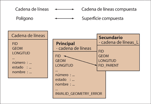 Puede convertir una clase de elemento de cadena de líneas o polígono en una clase de elemento compuesta. La clase de elemento de cadena de líneas o polígono existente es la clase de elemento principal y se crea una nueva clase de elemento secundaria. Se mantienen todos los atributos de la clase principal existente.