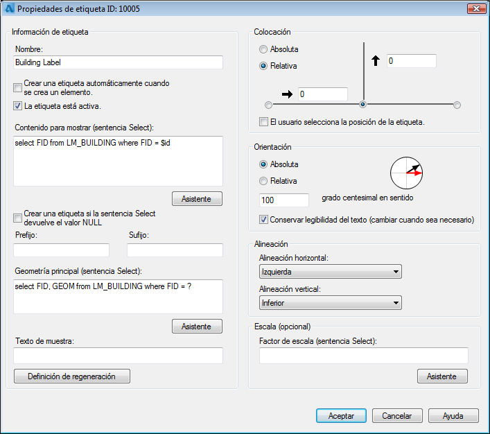 Las propiedades de etiqueta definen cómo se selecciona el texto de etiqueta de la base de datos y cómo se coloca la etiqueta.
