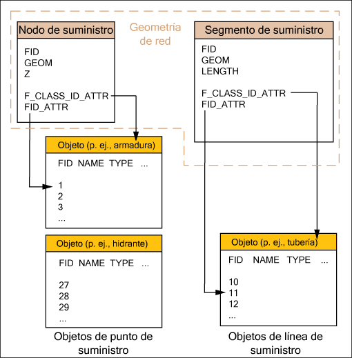 Los modelos de datos de suministro constan de nodos y segmentos que se almacenan en dos clases de elementos de geometría y datos de atributo que se guardan en clases de elemento de atributo. Cada elemento de suministro lo describe un elemento de geometría, que no dispone de ningún atributo específico (y no debe resaltarse), y sus elementos de atributo relacionados. Esto significa que el elemento de atributo relacionado determina el tipo de nodo.