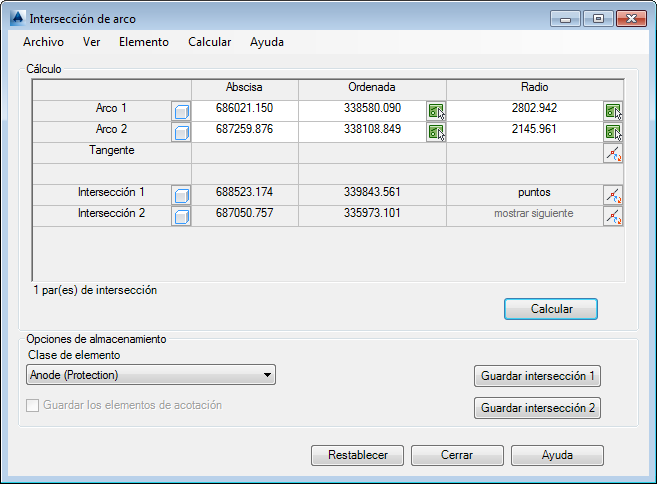 El siguiente cuadro de diálogo Intersección de arco muestra los controles y componentes del cuadro de diálogo para comandos de cálculo y construcción.