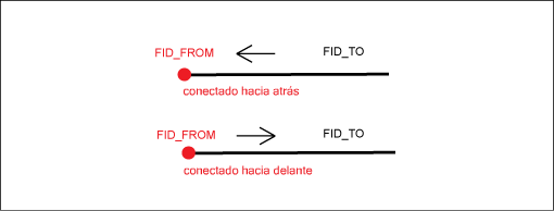 Especifica la dirección de flujo entre un elemento concreto (FID_FROM) y el elemento conectado (FID_TO).