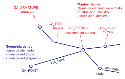 Los objetos de gas se almacenan en las clases de elemento de atributos GA_POINT.FID_ATTR (puntos de suministro) y GA_LINE.FID_ATTR (líneas de suministro). Tienen una relación con la clase de elemento de geometría de línea o de punto asociada. |