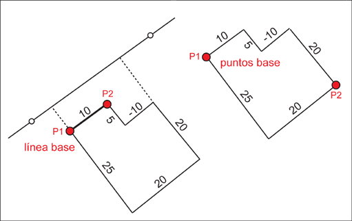 Use la función Recorrido de ángulo recto para construir definiciones de línea para edificios, siempre que se hayan definido al menos dos coordenadas (puntos existentes) y que se haya medido un ángulo recto (tamaño de contorno) entre los puntos conocidos.