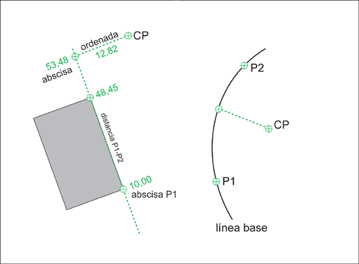 Use la función Cálculo ortogonal para las operaciones de topografía ortogonal de un modelo de sector empresarial . El elemento base se representa por medio de una línea existente o se define usando dos puntos que pueden estar situados uno junto a otro. Cuando se realiza el cálculo, se tienen en cuenta las acotaciones medidas y las calculadas.