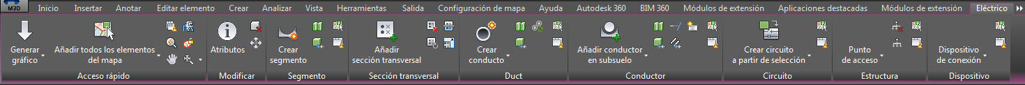 La ficha de la cinta de opciones del módulo de componentes eléctricos proporciona acceso a las operaciones más habituales en el módulo de componentes eléctricos de AutoCAD Map 3D toolset. Por ejemplo, puede crear un segmento con el panel Segmento. Para ello, añada una sección transversal mediante el panel Sección transversal y, a continuación, añada conductos y conductores con los paneles Conducto y Conductor. Utilice el panel Circuito para definir circuitos mediante la selección del elemento o mediante la realización de un rastreo. Utilice los paneles Estructura y Dispositivo para añadir estructuras y dispositivos. Los elementos que se crean con la ficha de la cinta de opciones del módulo de componentes eléctricos se muestran en los contenedores correspondientes del Explorador de componentes eléctricos. Véase Explorador de componentes eléctricos.