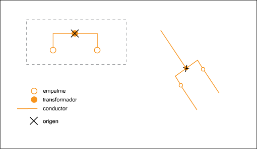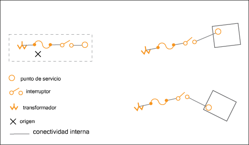 Ejemplo: esta plantilla de disposición de elementos eléctricos se puede utilizar en áreas residenciales para crear las conexiones a los puntos de servicio. En las áreas residenciales, los puntos de servicio suelen conectarse a un transformador mediante disposiciones de elementos idénticas. Una plantilla acelera la adquisición de datos en esta situación. Esta disposición de elementos no se agrupa: permite crear una instancia de la plantilla y, a continuación, desplazar cada punto de servicio individualmente a su ubicación exacta sin desplazar los otros elementos.