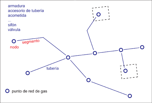 Topología de red de gas. Los puntos de red se conectan mediante líneas. Los puntos de red no deben situarse a lo largo de una línea de la red.