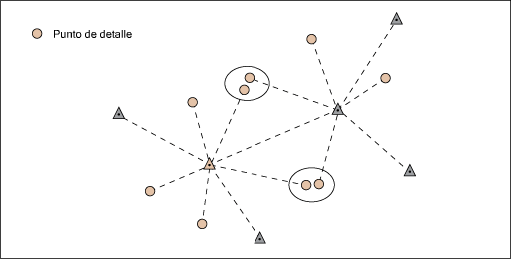 En el paso 5 del cálculo, se identifican los puntos que se han medido más de una vez. La aproximación del paso anterior del cálculo ofrece coordenadas para todos los puntos. Normalmente, las coordenadas de los puntos idénticos varían ligeramente.