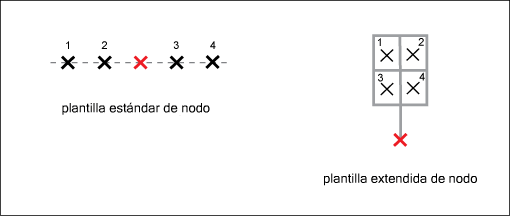 Torre con dos conductores. La sección transversal estándar muestra dos puntos de referencia para otros dos conductores. La sección transversal estándar se usa para la adquisición de datos y la sección transversal extendida se usa exclusivamente para la visualización.