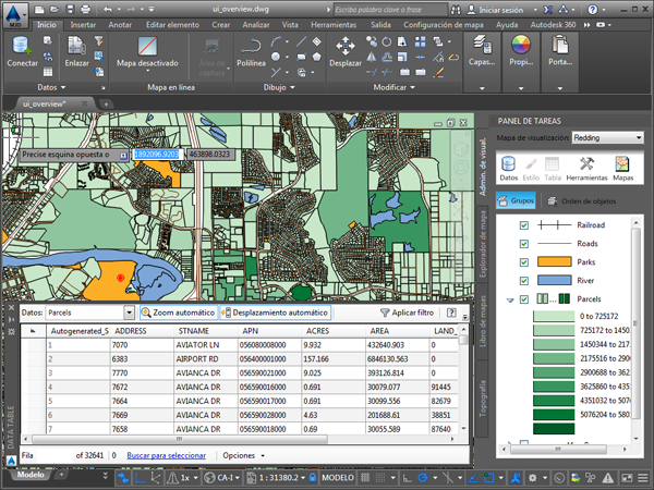Este mapa incluye capas del Administrador de visualización para ferrocarriles, carreteras, parques, ríos y parcelas. A cada una se le ha aplicado un estilo diferente. Para obtener una introducción a las partes de la ventana de AutoCAD Map 3D toolset, véase Lección 2: Conceptos básicos del AutoCAD Map 3D Toolset.