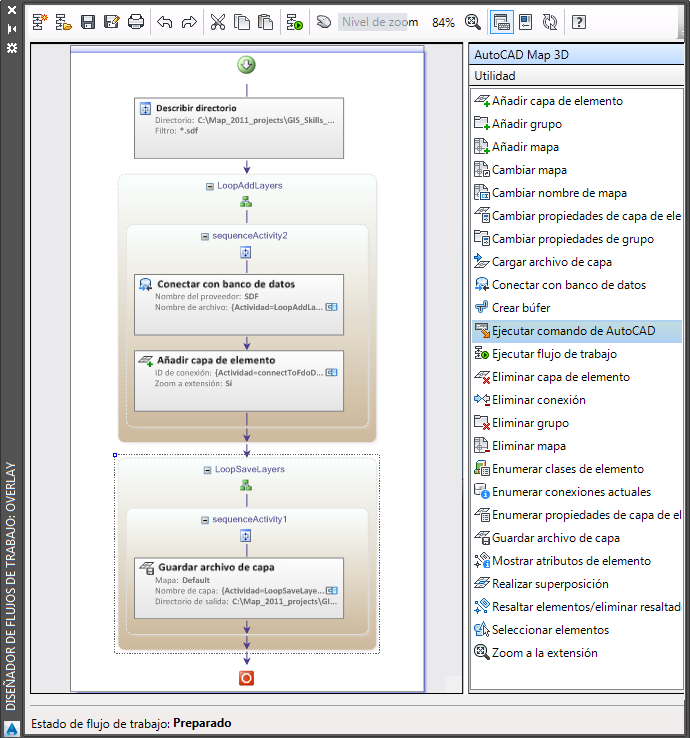 En este caso, la actividad ForEach se ha cambiado de nombre a “LoopAddLayers” para describir su funcionamiento. La actividad examina cada archivo SDF en la carpeta indicada en la actividad Exponer contenido del directorio. Para cada iteración, se conecta a un archivo SDF y añade una capa de elemento al Administrador de visualización.