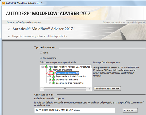 Nota: Para garantizar la instalación de este Inicio rápido, asegúrese de que se haya marcado la casilla Siemens NX Support al instalar el paquete de Autodesk Moldflow Adviser.