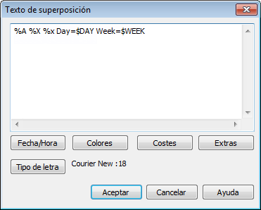 Configuración regional. Para especificar el formato exacto que se utilizará puede introducir texto en el cuadro de texto. Casi todo lo que escriba aparecerá tal como lo especificó, salvo algunas palabras precedidas del carácter "%" o "$" que actúan como palabras clave y se sustituirán por diferentes valores. Los botones Fecha/Hora, Coste y Extras pueden utilizarse para seleccionar e insertar todas las palabras clave posibles. El botón Colores puede utilizarse para definir el color del texto de superposición.