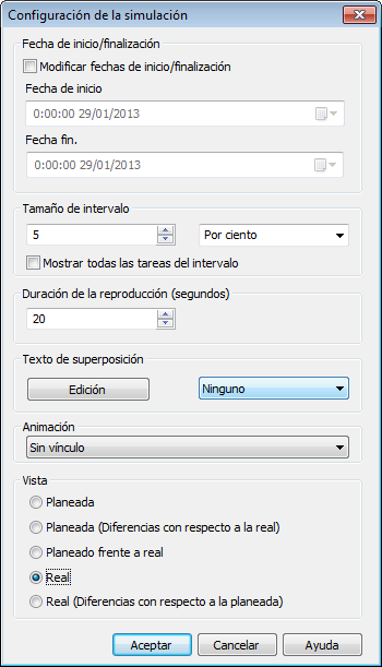 Es posible modificar las fechas de Inicio y Fin definidas para la ejecución de la simulación. Si selecciona la casilla Modificar fechas de inicio/finalización se activarán los cuadros de fecha y podrá elegir las fechas de inicio y finalización. De ese modo, podrá hacer una simulación de una pequeña subsección del proyecto completo. Las fechas aparecerán en la ficha Simular. Estas fechas se usarán también para la exportación de las animaciones.