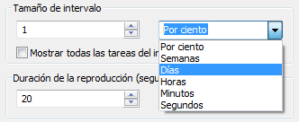 Puede definir el Tamaño de intervalo que se utilizará para avanzar en la simulación con los controles de reproducción. El tamaño de intervalo se puede establecer como un porcentaje de la duración total de la simulación o como un número absoluto de días, semanas, etc.