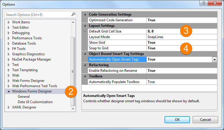2. In the Options dialog box, expand the Windows Forms Designer folder node in the Options tree and select General.