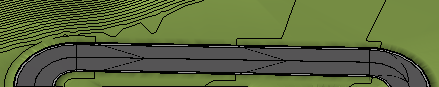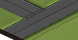 Al colocar la primera calle, Site Designer agrega canalones y bordillos en toda la calle, conforme a la definición de su familia. Al añadir una calle que se interseca con la primera, Site Designer detecta la intersección y solicita especificar el radio de la conexión. A continuación, ajusta la superficie topográfica, los bordillos y los canalones para las dos calles.