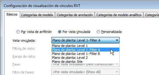 - Para Vista vinculada, seleccione la vista del modelo vinculado cuya configuración de visualización desea utilizar para el modelo vinculado en la vista de anfitrión actual.