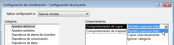 Antes o al copiar instalaciones de un modelo vinculado a un proyecto MEP, especifique un comportamiento de copia para cada categoría de instalación en el cuadro de diálogo Especificar la configuración de coordinación.