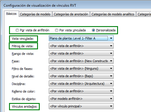 | Filtros de vista | Disponible solo para Personalizada. Especifica si el modelo vinculado se muestra con el filtro aplicado a la vista vinculada o la vista de anfitrión. No controla la visualización de modelos anidados. |