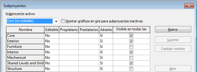 Al crear un subproyecto, utilice la opción Visible en todas las vistas del cuadro de diálogo Nuevo subproyecto para indicar si ese subproyecto se debe mostrar en todas las vistas del modelo. Este parámetro se refleja en la columna Visible en todas las vistas, en el cuadro de diálogo Subproyectos.