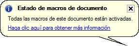| Preguntar antes de activar macros de documento | Definido por el usuario. | Un cuadro de advertencia pide confirmación para activar o desactivar macros. El icono visible dependerá de la respuesta que dé el usuario. Es la opción por defecto. |