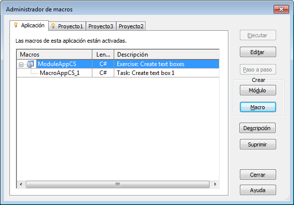 - En el Administrador de macros, seleccione la ficha Aplicación (para macros de nivel de aplicación) o una ficha de proyecto (para macros de nivel de documento) en que colocar la macro.