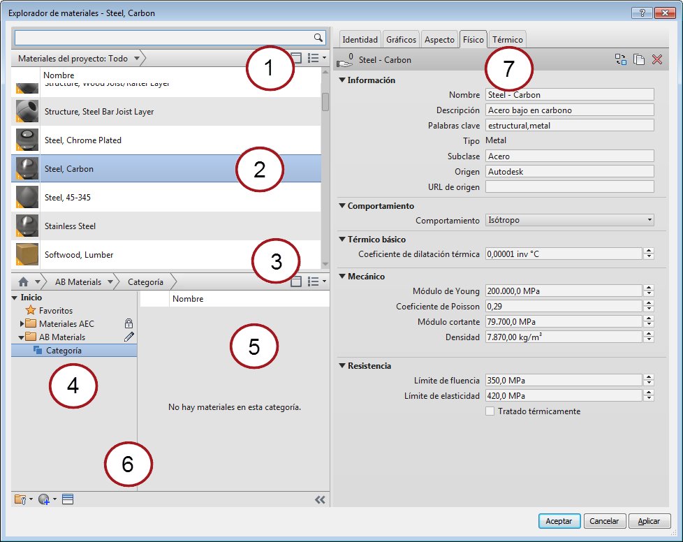 | 7 | Cuando se selecciona un material en la lista de bibliotecas (panel izquierdo), el panel derecho muestra las fichas (objetos) asociadas al material. Haga clic en las fichas (por ejemplo, Identidad o Apariencia) para ver las propiedades y objetos del material. Cuando se visualizan los materiales de las bibliotecas, las propiedades son de solo lectura. |