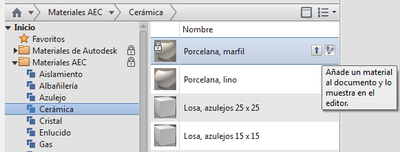 - En la lista de materiales de la biblioteca, haga clic en un material y, a continuación, haga clic en el botón Añadir-Editar