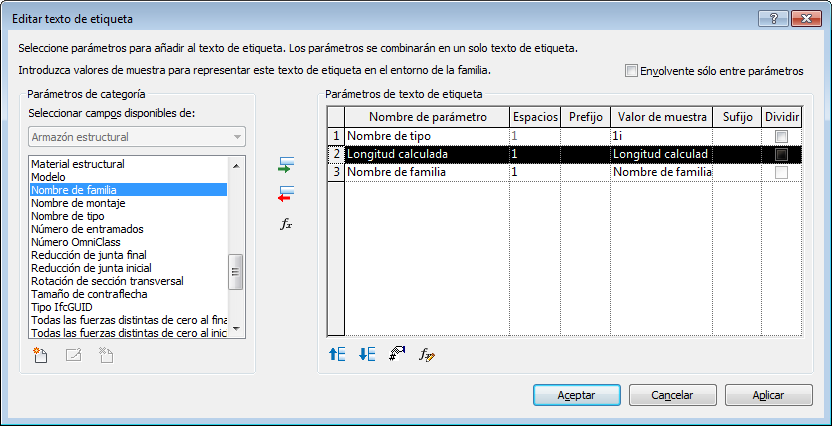 La ventana de parámetros de categoría contiene los parámetros de texto de etiqueta relacionados con el tipo de etiqueta. La ventana Parámetros de texto de etiqueta contiene los parámetros de categoría que aparecen en el texto de etiqueta. Por lo general se trata de un solo parámetro, pero puede definir textos de etiquetas más complejos.