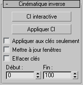 Le panneau déroulant Cinématique inverse affiche différents contrôles en fonction de la Solution CI appliquée à la hiérarchie sélectionnée. Les Solutions CI sont appliquées aux hiérarchies par l'intermédiaire du menu Animation.