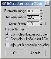 Vous pouvez également utiliser cet outil pour convertir n'importe quelle piste du contrôleur en une simple piste associée à des images clés. Vous pouvez convertir les pistes de rotation en rotation Euler ou TCA et réduire les pistes Position et Echelle vers les contrôleurs Bézier ou Linéaire.