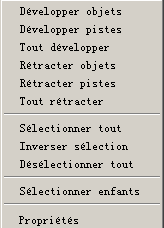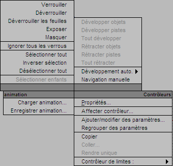 Un menu quadr. permettant d'accéder à des outils apparaît lorsque vous cliquez avec le bouton droit de la souris dans la fenêtre Clé ou dans la liste hiérarchique. Le contenu du menu dépend de la sélection. Par exemple, lorsque la liste hiérarchique est active, vous pouvez affecter des commandes copier et coller et accéder aux propriétés pouvant être animées. Vous pouvez définir les contrôles Développement auto. et Navigation manuelle pour modifier le comportement de l'affichage de la fenêtre Contrôleur.
