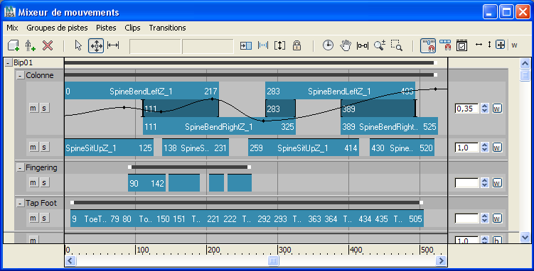Le mixeur de mouvements vous permet de mixer des clips de séquence affectés à des objets bipèdes et non bipèdes. Le concept du mixeur de mouvements se fonde sur le mixage audio effectué dans les industries de la musique et du son. Comme un mixeur audio, le mixeur de mouvements vous permet d'ajouter une série de pistes pour chaque objet d'une scène. Vous ajoutez des clips à chaque piste sous la forme de fichiers BIP ou XAF. Vous pouvez également ajouter des transitions pour lier les clips. Il est possible de filtrer les clips et les transitions afin que leur mouvement affecte uniquement des parties spécifiques des objets.